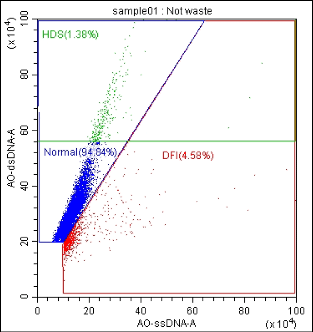 どれだけ形態・運動率のよい精子でも、精子の核の状態までは、顕微鏡下で判断することはできません。精子は、酸化ストレスなどのダメージで、DNAが損傷することがあり、男性不妊症の患者様では、DNAの損傷を受けた精子の割合が多いと言われています。SCSAでは、精子のDNA状態を調べ、DNAが損傷している精子の割合を測定します。
