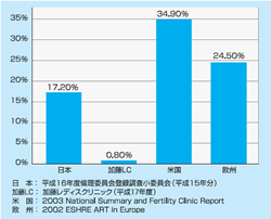 治療周期数の増加に伴い国内に多胎妊娠の総数で増加し、NICUの慢性的な満床状態など周産期医療に重大な負担をかけている。こうした状況を考慮し、日本産科婦人科学会は1996年の会告で移植胚数を3個までに制限している。この会告の前は移植胚数に制限なく品胎以上の妊娠もしばしば認められていた。現在の移植数3個の制限下でも双胎や品胎の頻度はさほど減少せず、米国の35%、欧州の25%に比し幾分低いとはいえ、国内のART施設の多胎頻度は17%とまだ高率である(図2)。ちなみに、日本での多胎頻度が諸外国より低いのは、採卵数、妊娠数の多い当クリニックでの多胎頻度の低さが寄与している。当クリニックでは紹介したように分割期胚、胚盤胞にかかわらず原則として全例SETを実施している。当クリニックでのSET成績を支えているのは新鮮胚と凍結胚の移植成績がほぼ同一であるという高い凍結技術にあるといっても過言ではない。2個の分割胚が得られた場合、多くの施設では2個移植が選択されるであろう。当クリニックでは1個を新鮮胚移植し、余剰胚は凍結保存している。妊娠しなかった場合は、次周期以降の移植とし、妊娠に至った症例では第二子として有効活用する方法を選択する。この方法により多胎妊娠は限りなく減少し、しかも採卵1回あたりの妊娠率は複数胚移植よりも上昇することもわかってきた。